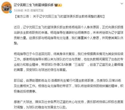 對于楊鳴如今主動請辭,遼籃官微下輿論普遍認為楊鳴解脫了: