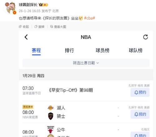 根據媒體人球圈趙探長報道,楊鳴辭職之后,他將火線重回解說席位,將在1月29日與美娜、孔祥宇,一起解說1月29日湖人對陣騎士的焦點NBA比賽。