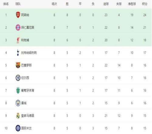 前七輪戰(zhàn)罷,分別排名第九到第十一位的巴塞羅那、葡萄牙體育和曼城最后一輪分別擊敗各自對手,壓哨闖入前八,最終阿森納、拜仁慕尼黑、利物浦、熱刺、巴薩、切爾西、葡萄牙體育和曼城分別排名第一到第八,而此前高居第三的皇馬,只能以第九名的身份去參加附加賽。
