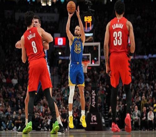 北京時間12月15日,NBA常規賽繼續進行,勇士客場挑戰開拓者。經過四節鏖戰,勇士在客場131-136惜敗開拓者。比賽中。圖源:視覺中國本場比賽,勇士主將庫里出戰35分鐘,26投16中,三分19中